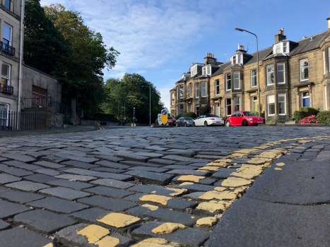 Setted surface looking West up Dean Park Crescent